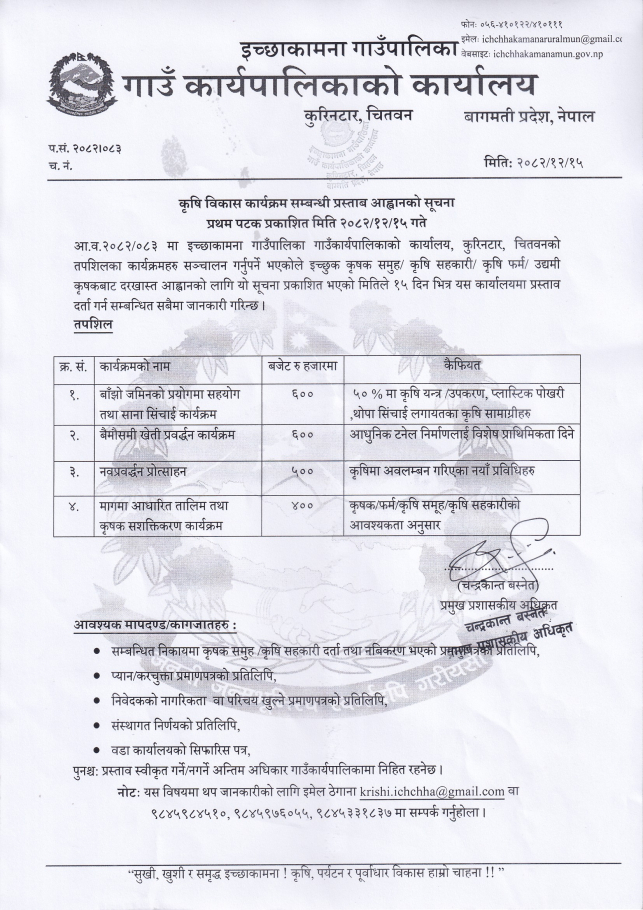 कृषि विकास कार्यक्रम सम्बन्धी प्रस्ताव आह्वानको सूचना।