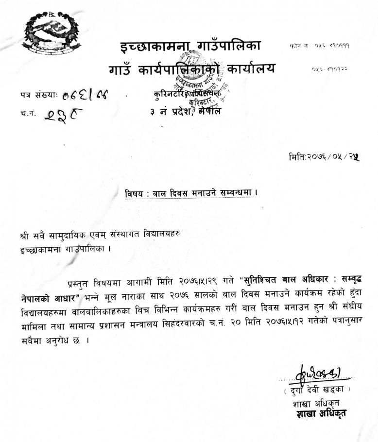 बाल दिवस मनाउने सम्बन्धमा | श्री सबै सामुदायिक एवं संस्थागत विद्यालयहरु, इच्छाकामना गाउँपालिका |