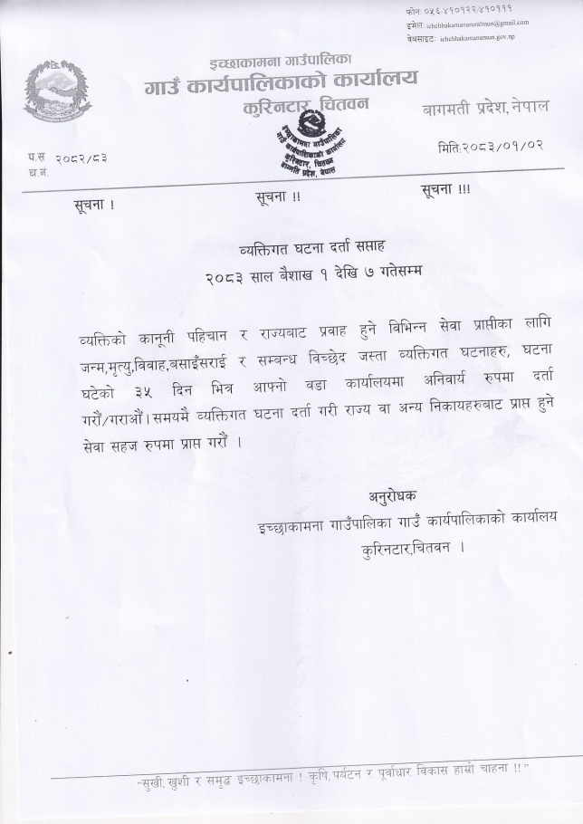 व्यक्तिगत घटना दर्ता सप्ताह २०८३ साल बैशाख १ देखि ७ गते सम्म
